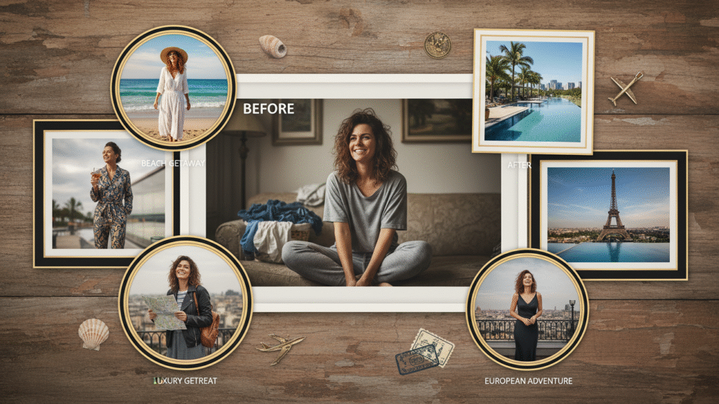 👉 Basta colar sua foto na IA e pronto: fotos incríveis, como se você estivesse lá de verdade!